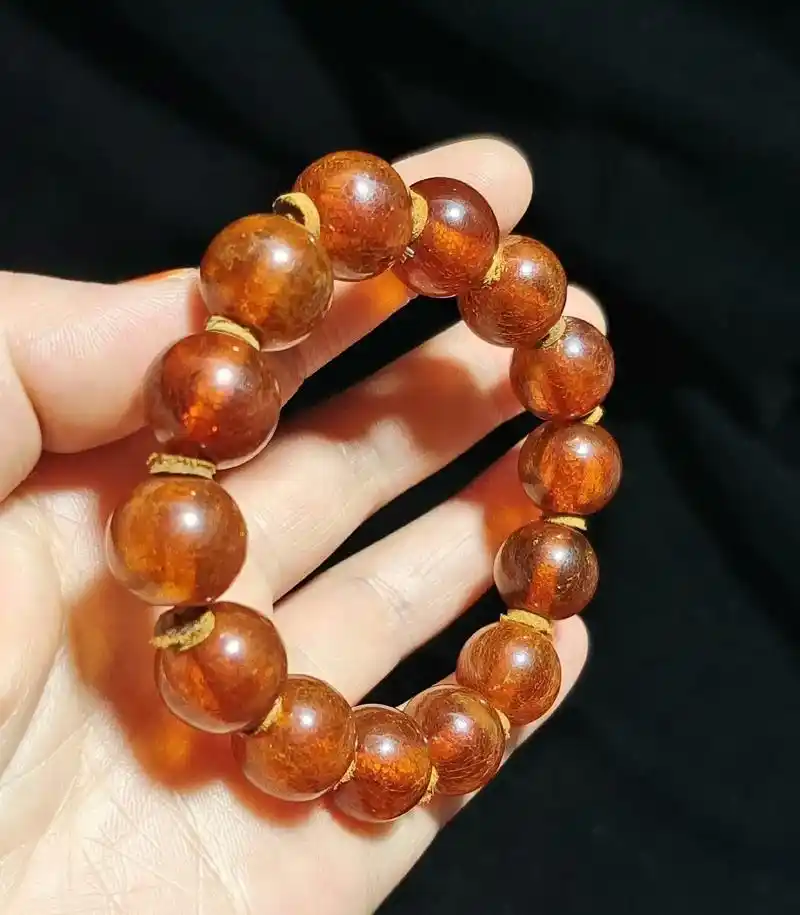 清代时期老琥珀珠子朝珠,手工打磨痕迹明显,不是正圆,水亮孔