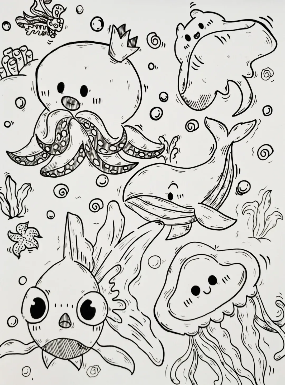 我刚完成了一幅超炫的"海洋世界"简笔画,感觉自己仿佛潜入了海底探险