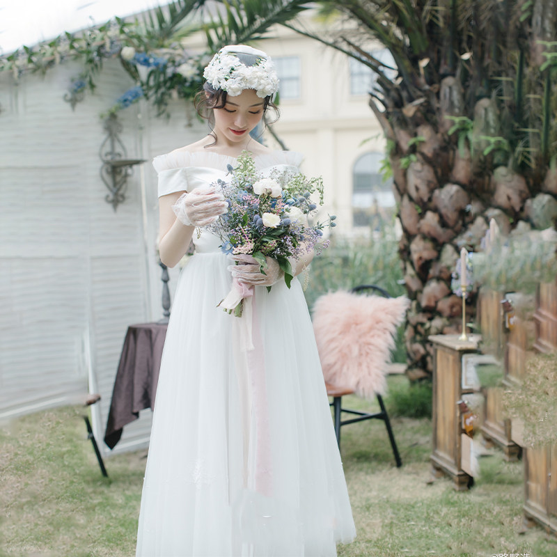 原创实拍一字肩复古灯笼袖清新森系户外草坪新娘仪式旅拍轻婚纱