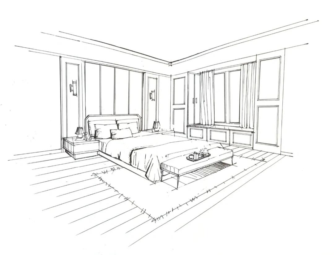 两点透视手绘卧室空间步骤图 线稿步骤图来啦 一步一步深入