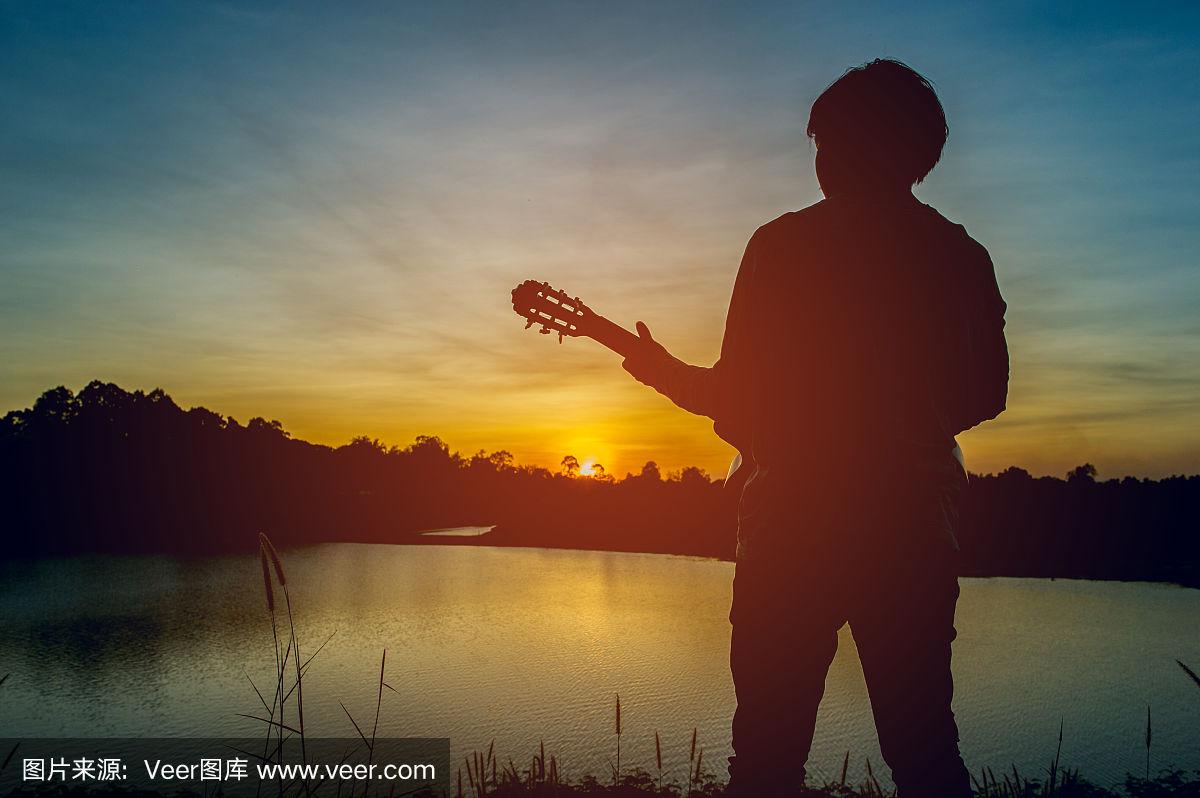 夕阳下,吉他手在河边弹奏吉他的剪影