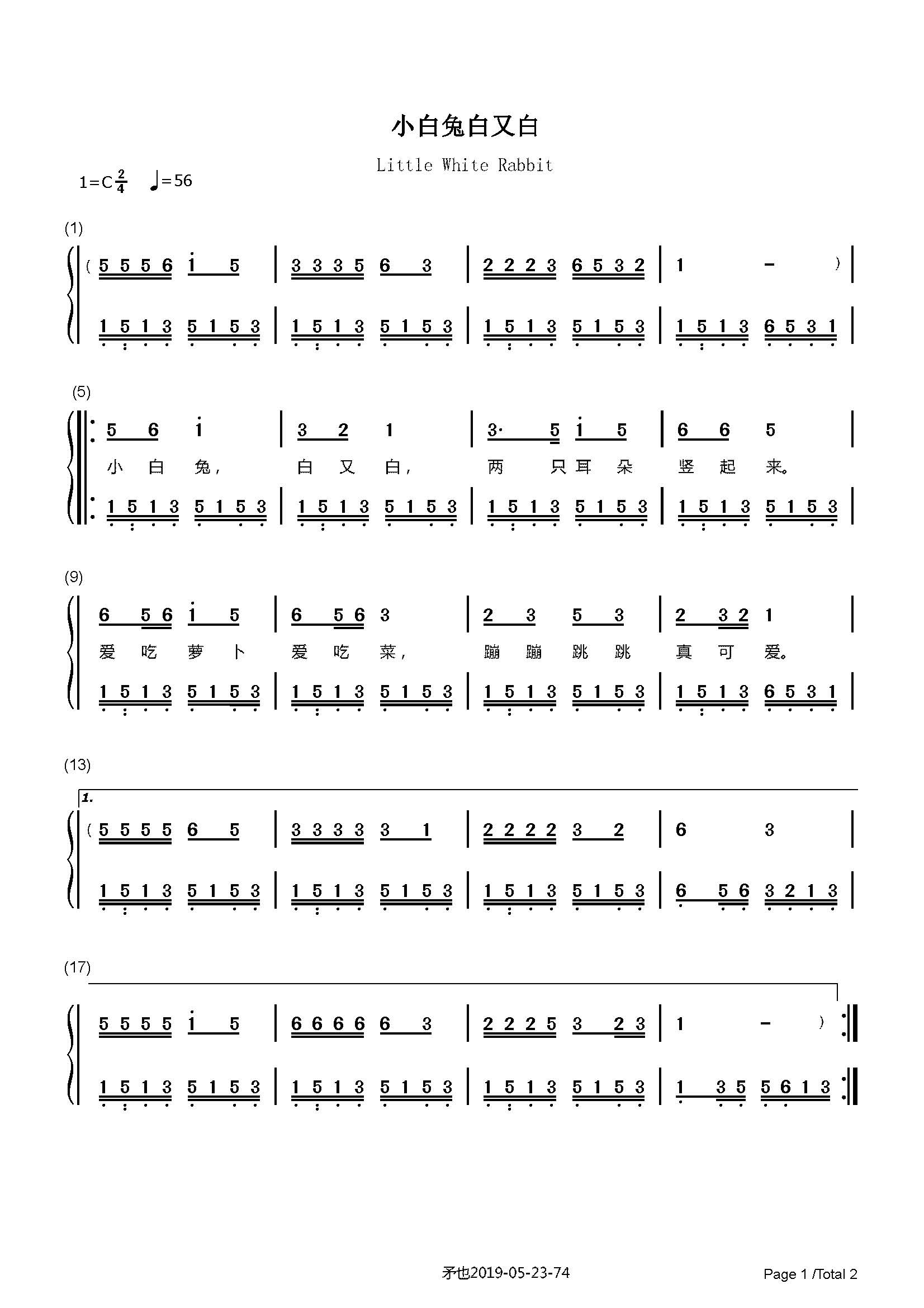 小白兔白又白-儿歌-c调 -流行钢琴简谱
