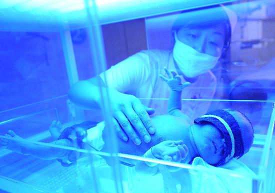 图文:护士在给刚出生10多天的婴儿照蓝光