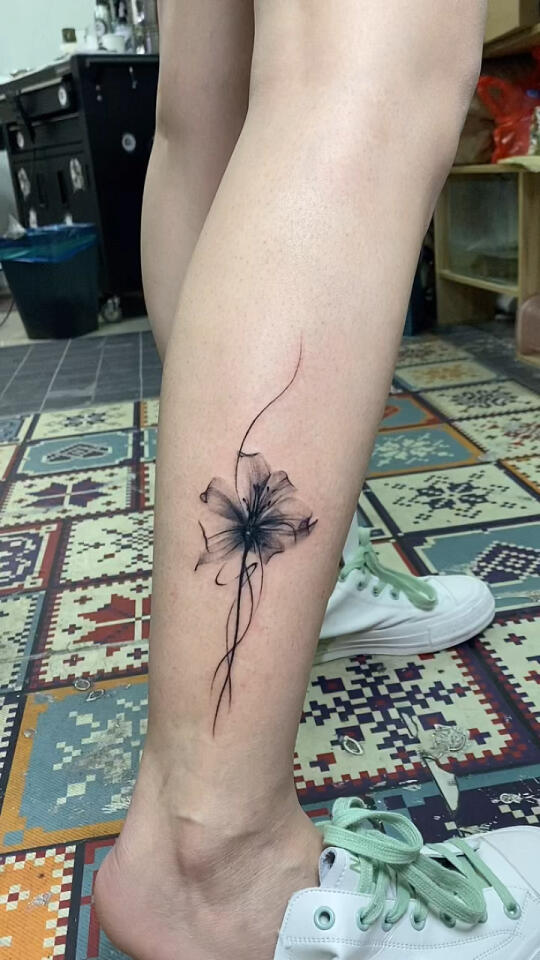 小腿黑灰花儿脚链纹身图案