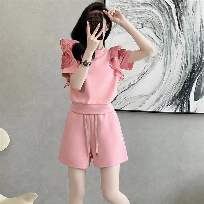 粉色t恤套装夏季减龄2022年新款可盐可甜学生休闲时尚短裤两件套