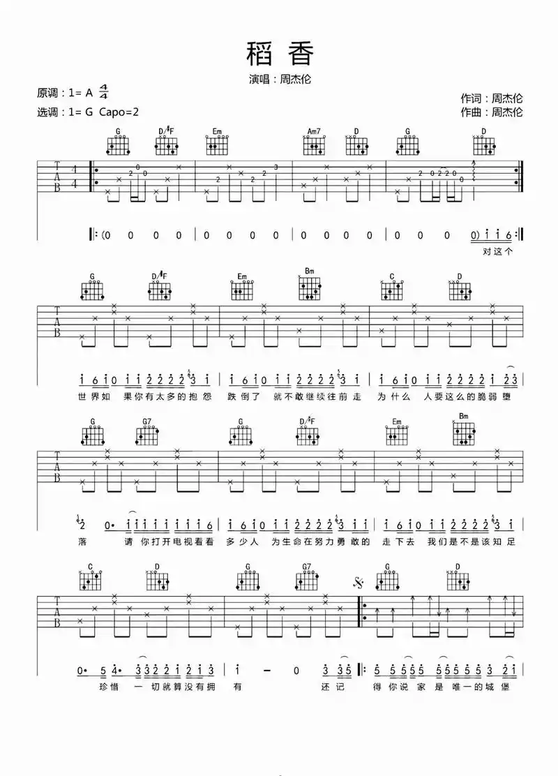 稻香吉他谱#周杰伦 #乐谱 - 抖音
