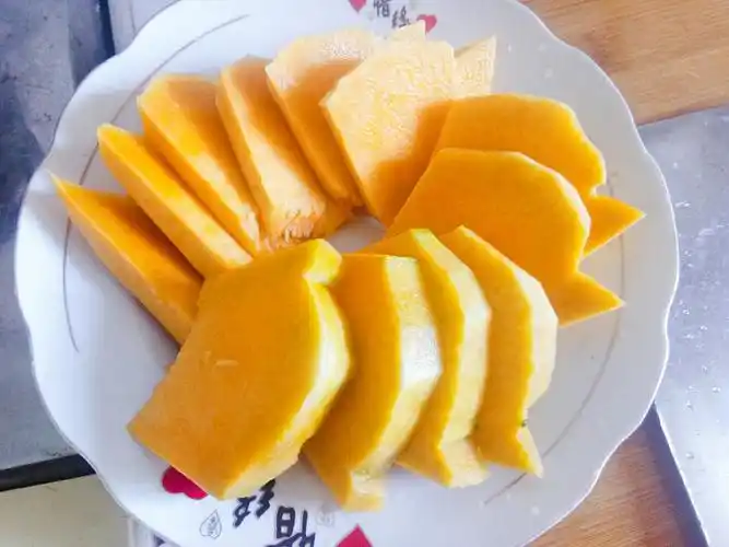 南瓜洗净切两厘米左右的后片,摆放容器里.