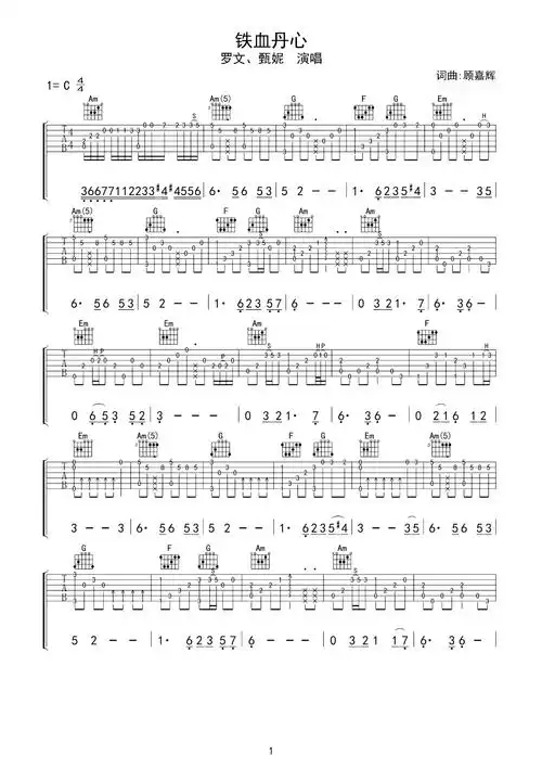 罗文/甄妮 铁血丹心吉他谱 g调高清弹唱谱【图片谱】