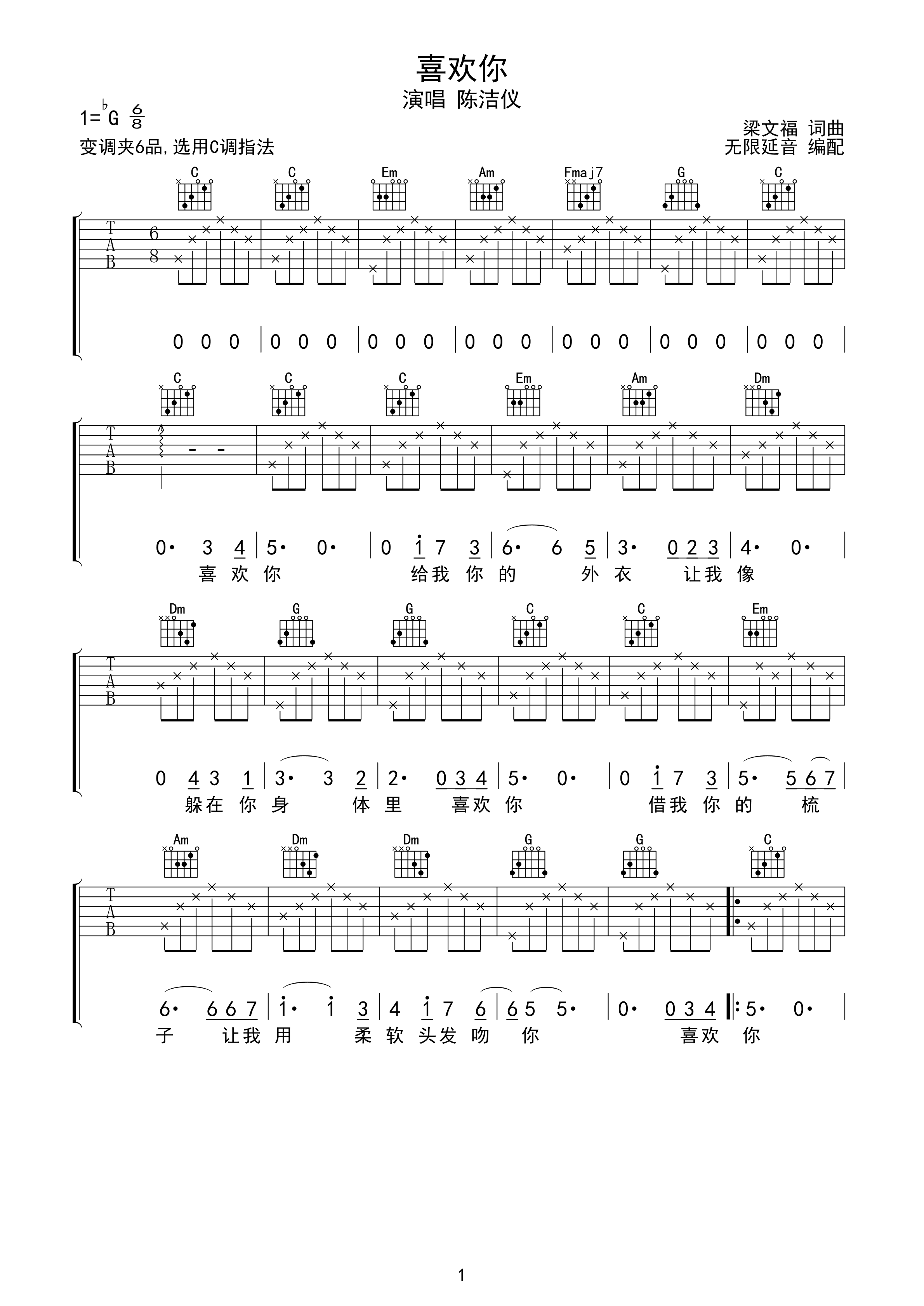 陈洁仪 喜欢你 吉他谱 c调指法f#调六线吉他谱-虫虫吉他谱免费下载