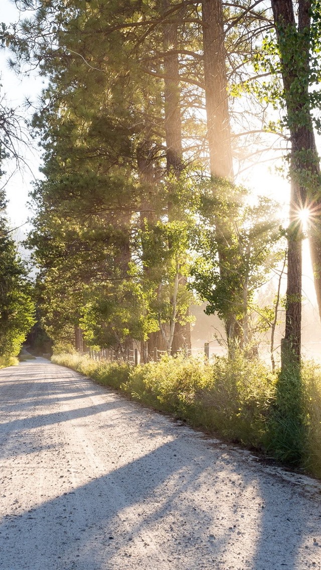 路,树木,太阳光线,河流,早晨