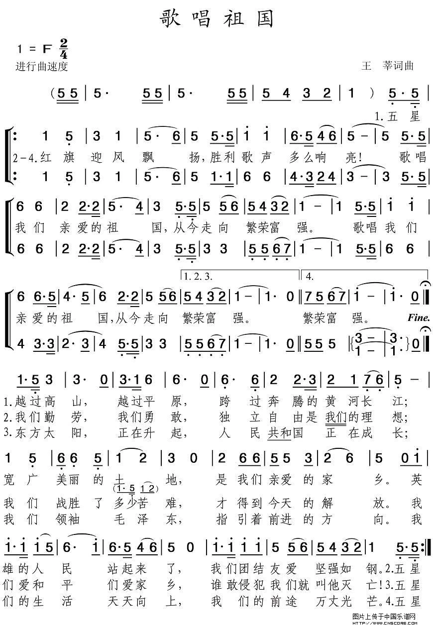 王莘 赵行道 - 歌唱祖国 合唱简谱f调钢琴五线谱正谱