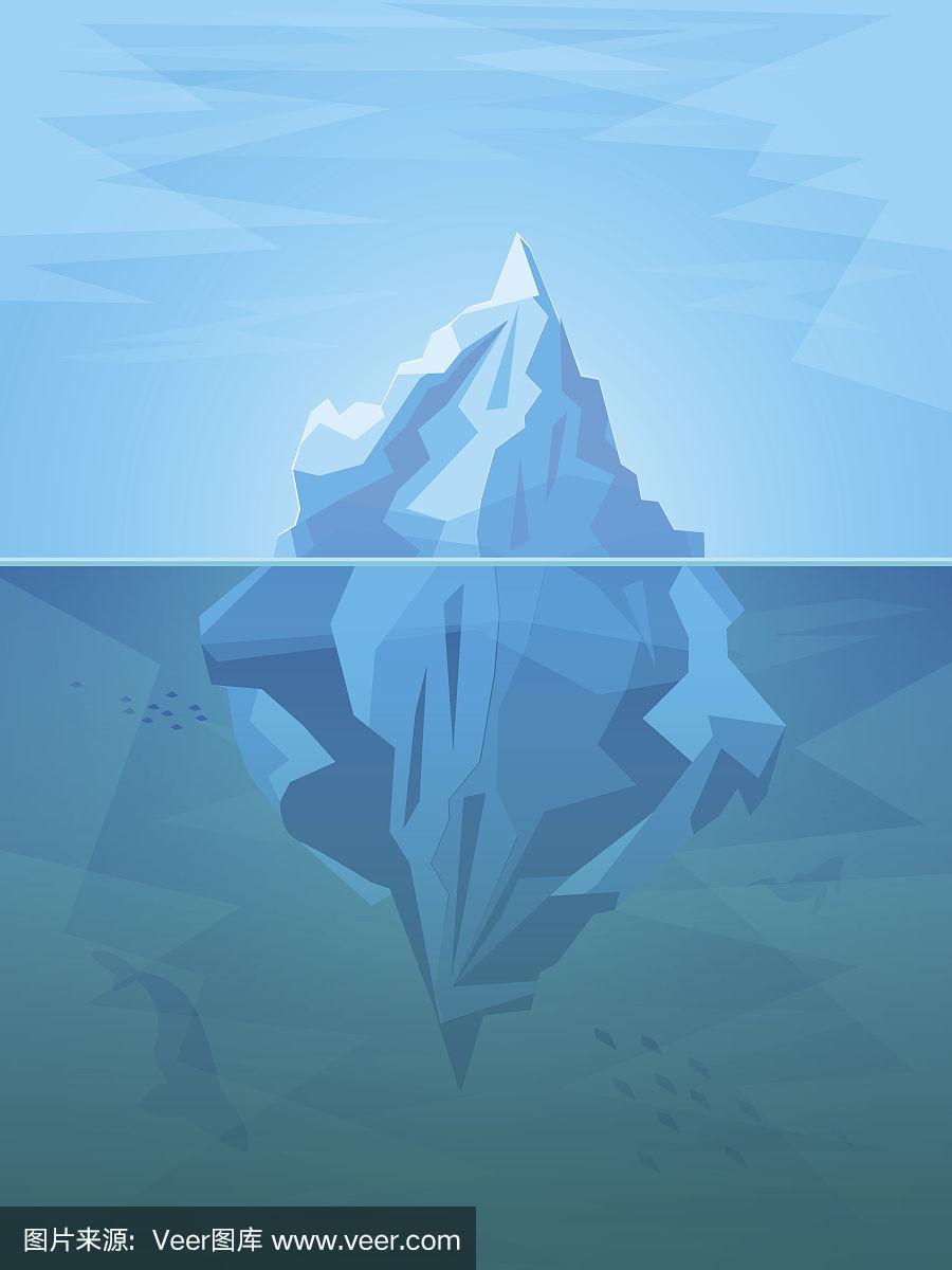 海面上漂浮的冰山平面矢量与水下部分卡通插图,水下的冰山或冰山