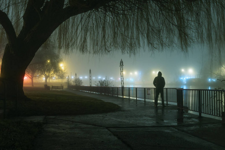 在一个多雾的冬夜,一个神秘的,喜怒无常的戴着兜帽的人在河边的路灯下