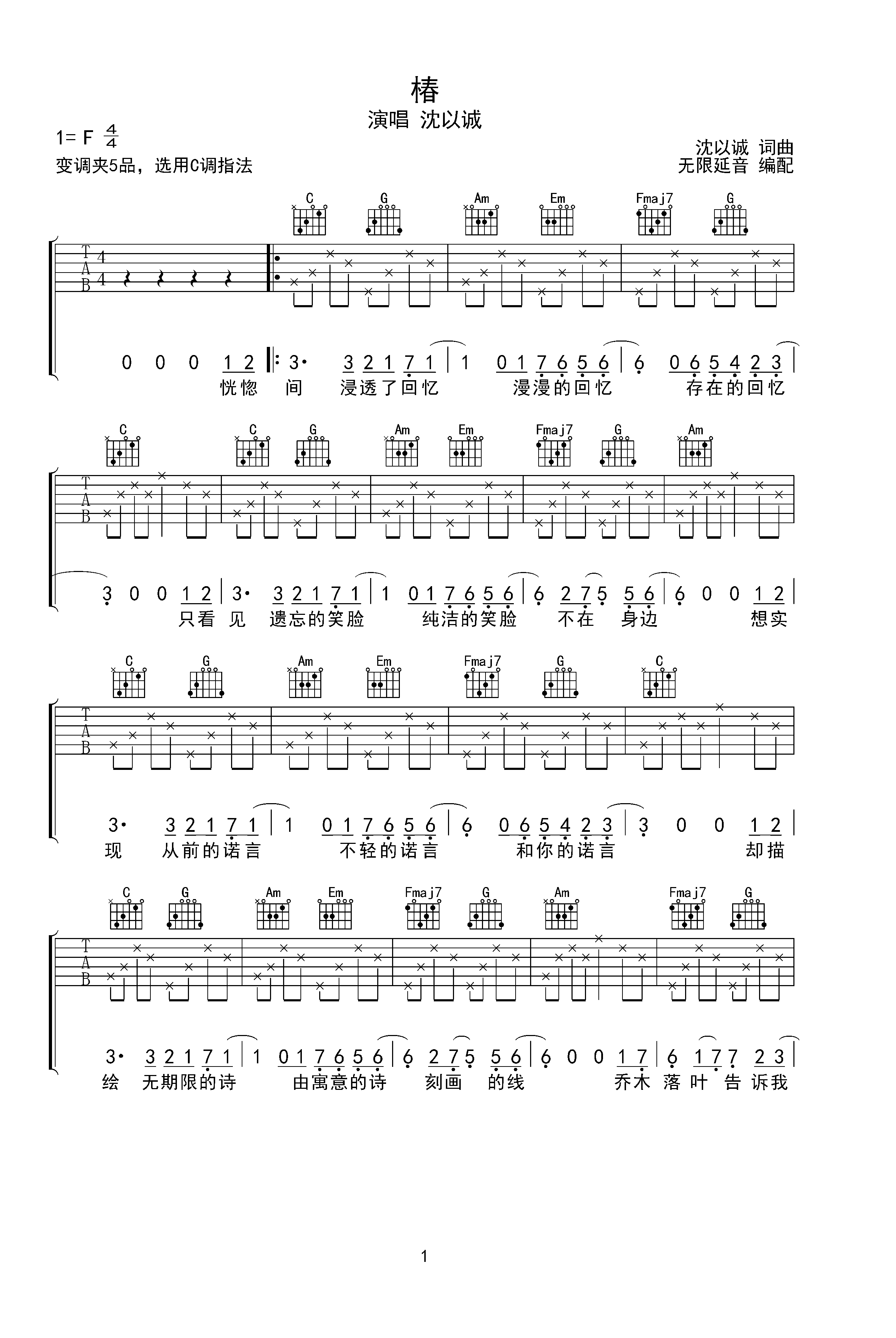 沈以诚椿吉他谱c调吉他弹唱谱