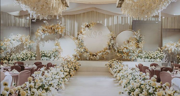 香槟色婚礼场景装饰花艺 婚庆背景墙舞台t台布置地排花路引花点花