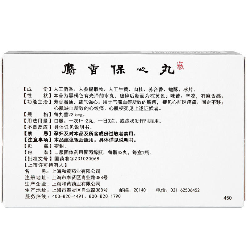 上药牌 麝香保心丸 22.5mg*60丸/盒 详见说明书