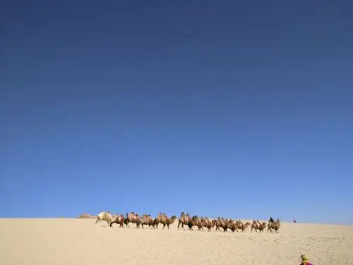 坐着骆驼,行走在戈壁滩上,欣赏大漠美景,不亦乐乎!