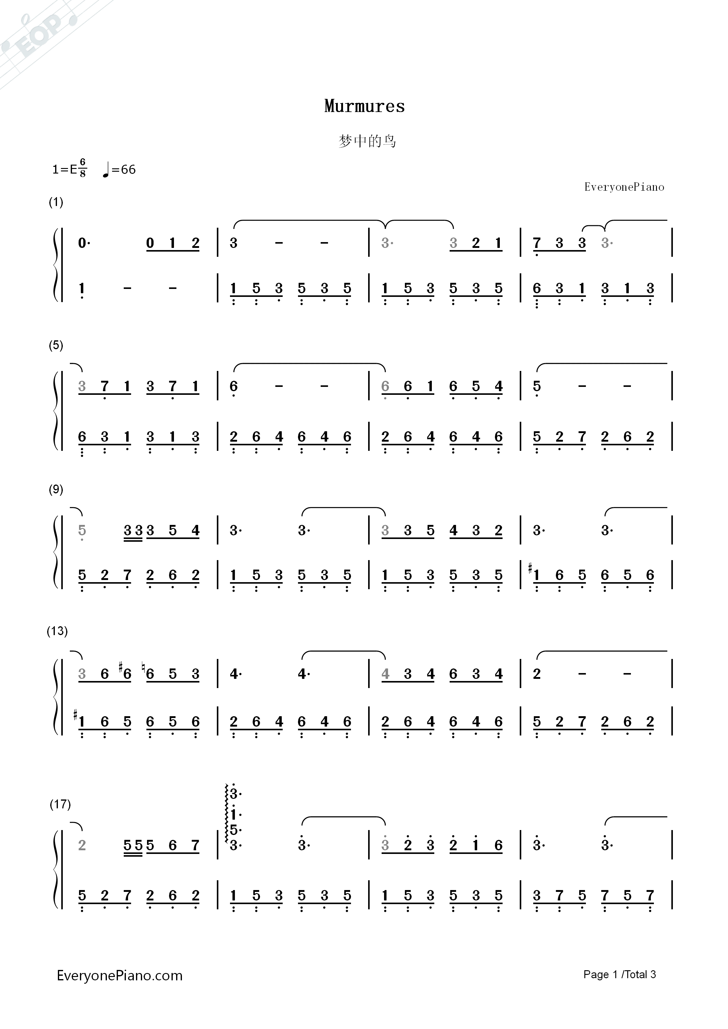 murmures(梦中的鸟)简谱_流行简谱_嗨瑶简谱网
