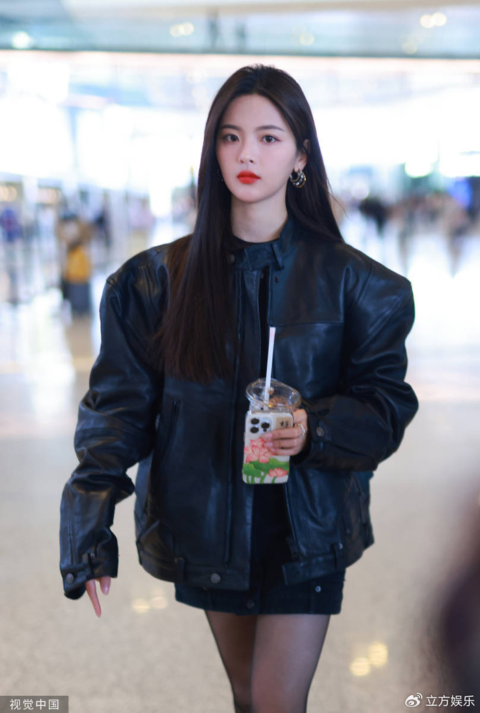 原创杨超越美到国外了穿黑色廓形小皮衣配白衬衫酷中带甜很有范