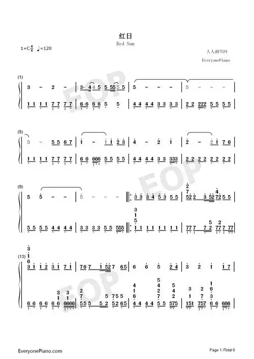 红日(中国经典)钢琴谱 钢琴简谱 双手简谱 下载
