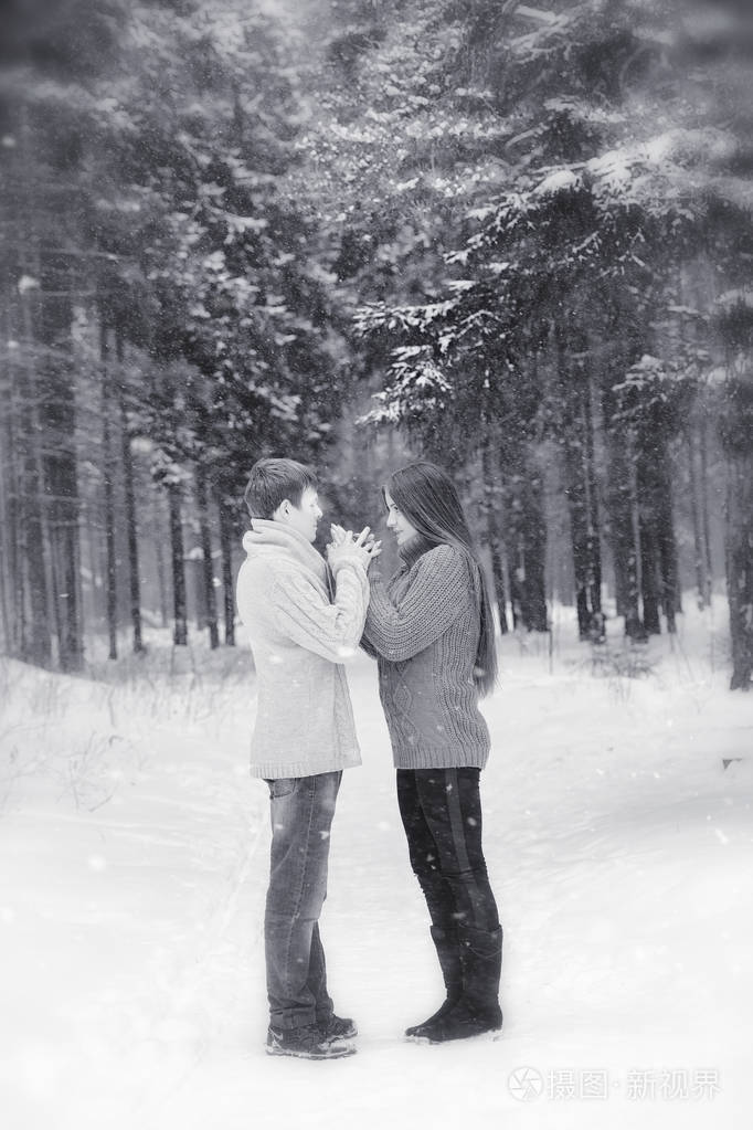 一对相爱的情侣在冬天散步.男人和女人在一个日期