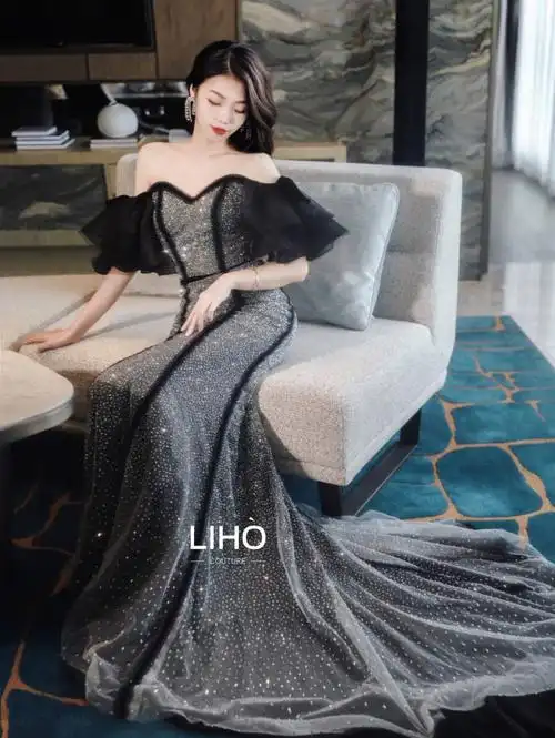 丝绒宴会晚礼服一字抹胸性感年会主持人鱼尾裙长款连衣裙