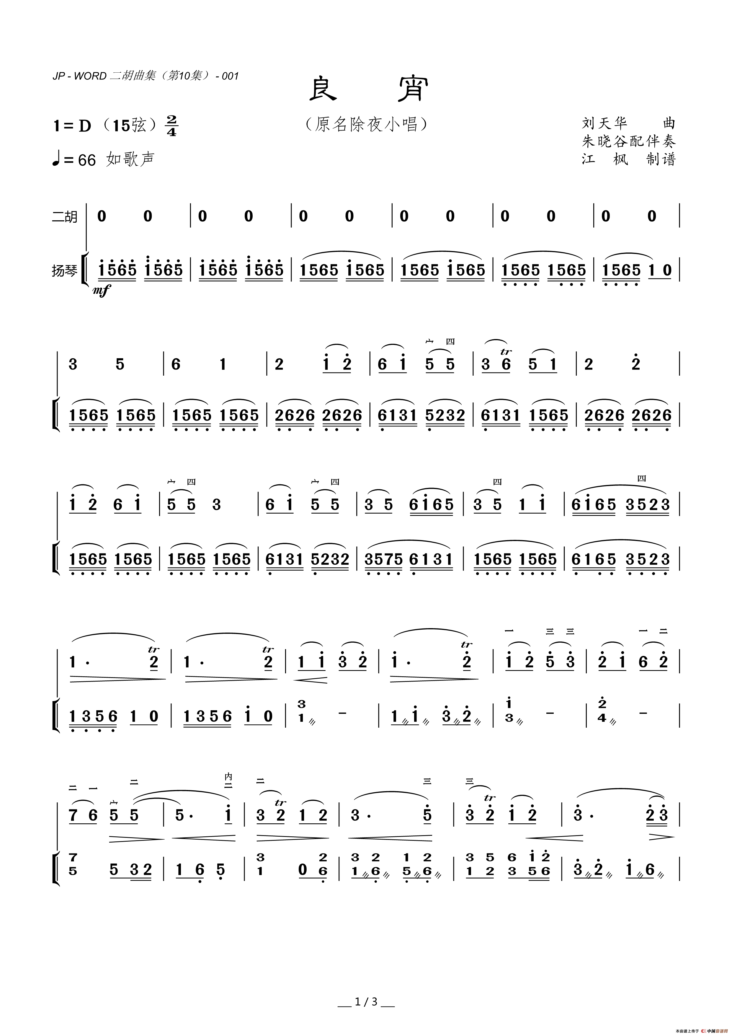 良宵(又名:除夜小唱)[二胡曲谱]简谱_良宵(又名:除夜小唱)[二胡曲谱]