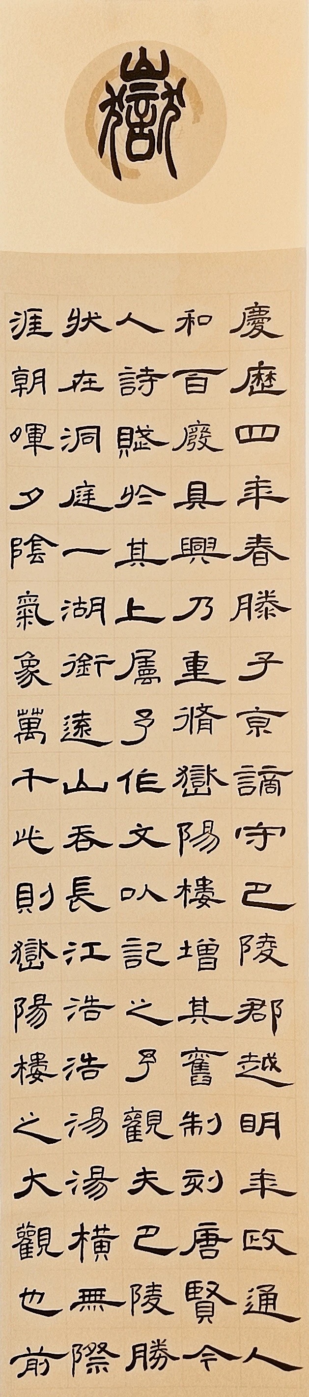 隶书创作《岳阳楼记》,采用隶书曹全碑的风格,结构扁平舒展,笔画圆转