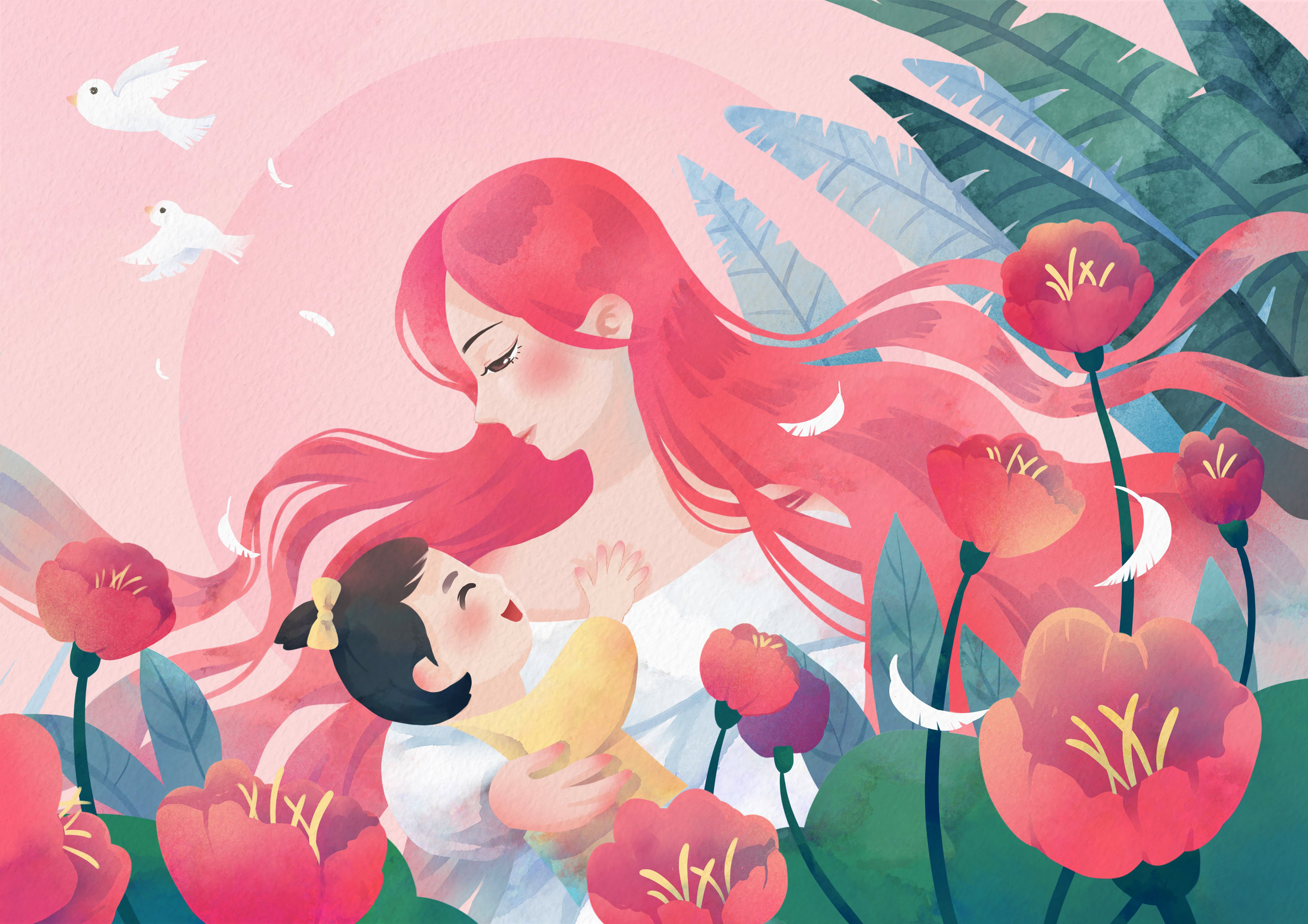 手绘亲子插图母亲节插画妈妈与孩