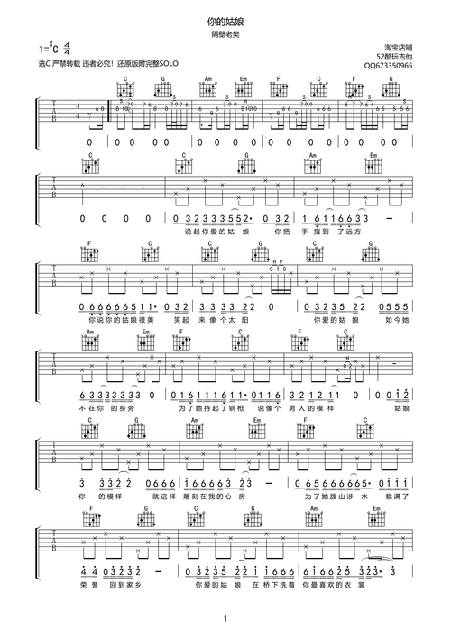 你的姑娘吉他谱原版_隔壁老樊_c调高清六线谱 - w吉他谱