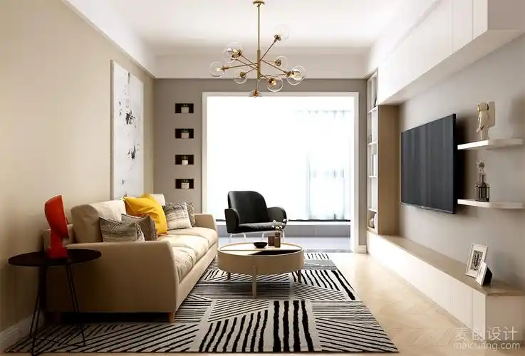 整体风格为现代北欧风格,采用原木色的地板,米白色沙发,电视背景墙以