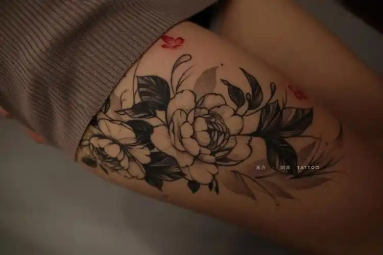 素花彩色蝴蝶女生大腿纹身小腿小清新