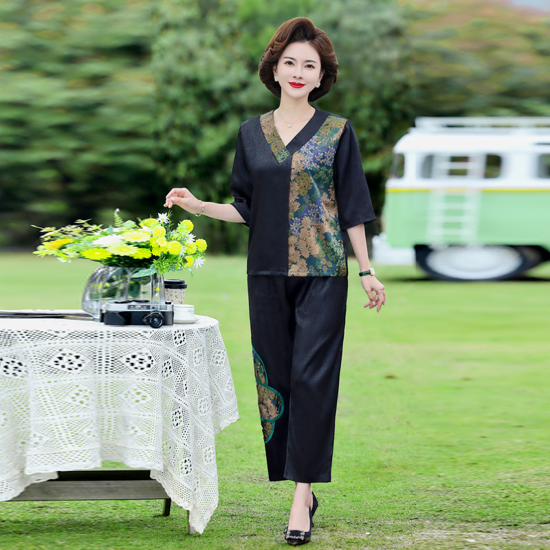 妈妈装洋气减龄小衫中年女夏装短袖t恤上衣中老年女装大码印花套装
