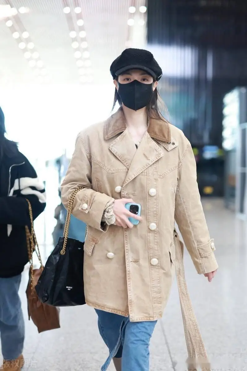 钟楚曦机场街拍,黑色运动外套搭配破洞牛仔裤,棒球帽随性时髦!