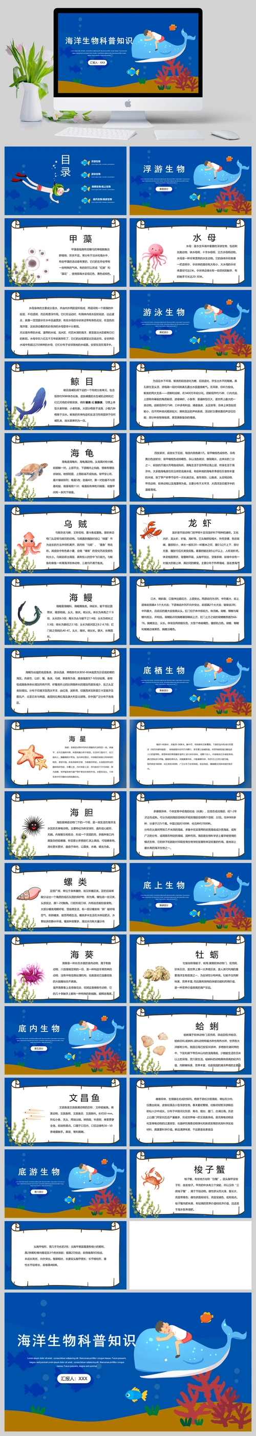 蓝色卡通趣味蓝色海洋生物科普知识ppt模板