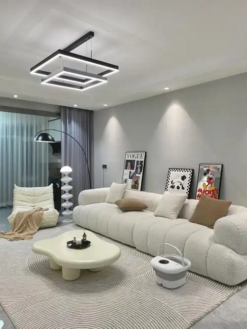 没有使用当下流行的太空漫步,沙发背景墙是浅灰色,其余全屋都是大白墙