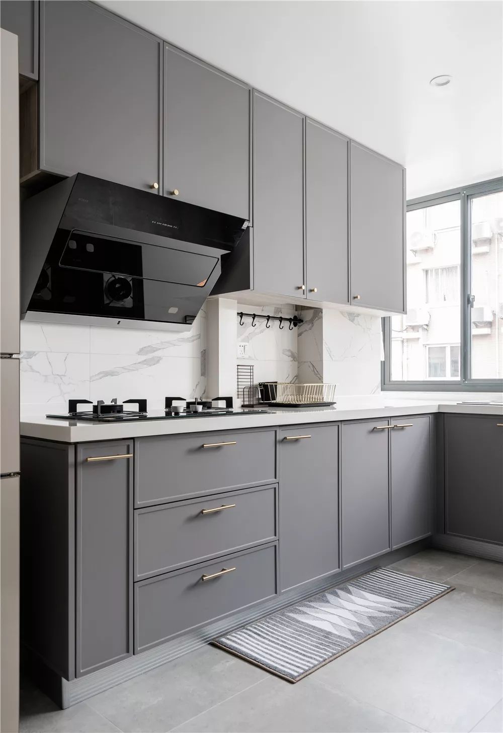 厨房白色的墙地砖和柜门的灰色形成鲜明的对比,既符合整体风格又不同