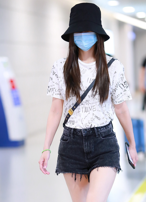 angelababy穿字母t恤,搭配牛仔短裤,秀出纤细美腿苗条又年轻