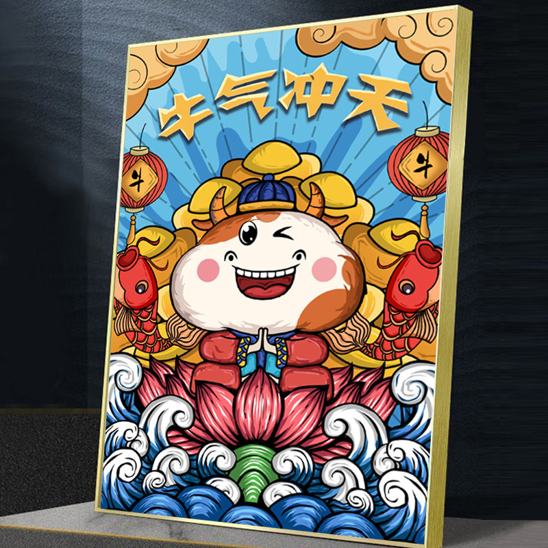 牛气冲天钻石画满钻中国风招财客厅竖版卡通十字绣2021新款小件