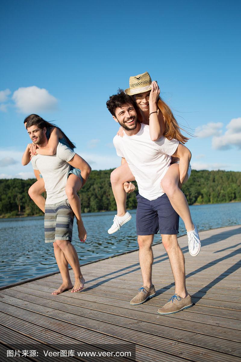 一对年轻情侣在湖边,男人背着女朋友
