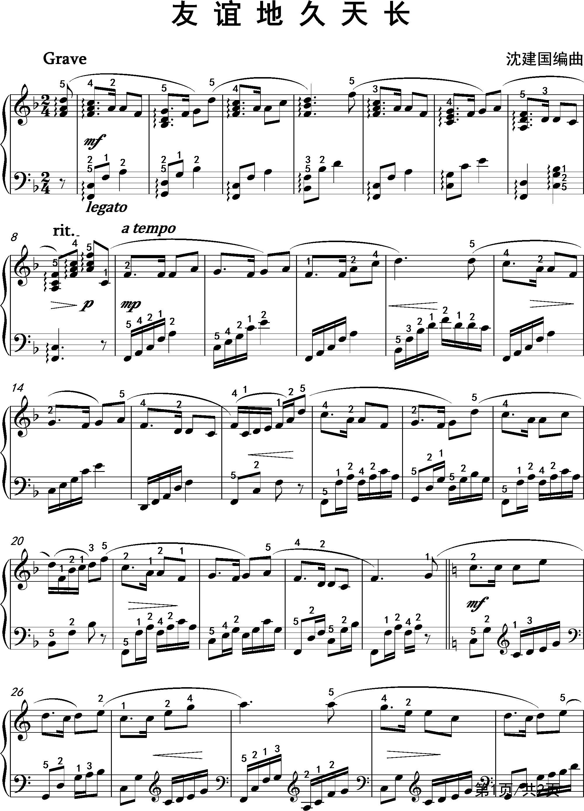 友谊地久天长-钢琴五线谱-f调-流行钢琴五线谱