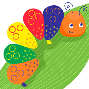 有趣的彩色毛毛虫. 微笑的昆虫在绿色的离开. 矢量插图卡通婴儿风格.