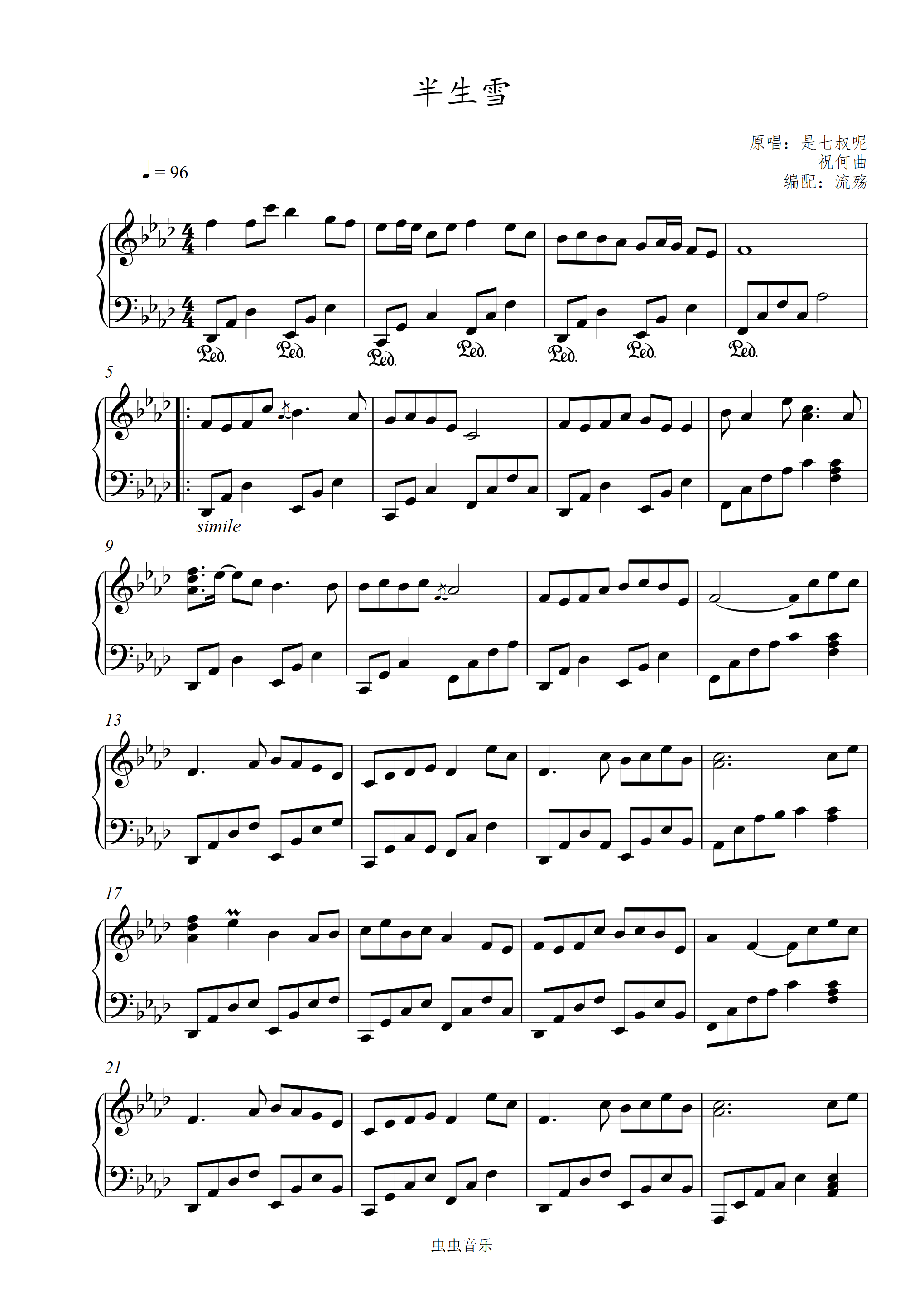 《半生雪》是七叔啊-c调简易优化版钢琴谱-虫虫钢琴