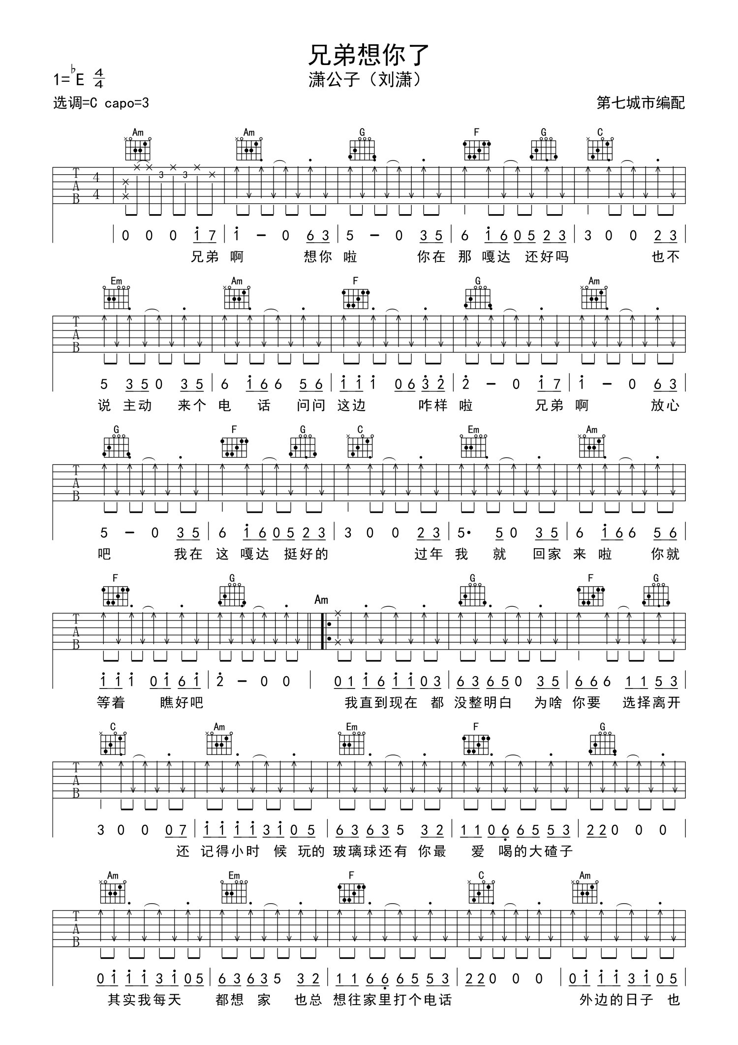 兄弟想你了吉他谱 潇公子(刘潇) c调高清弹唱谱