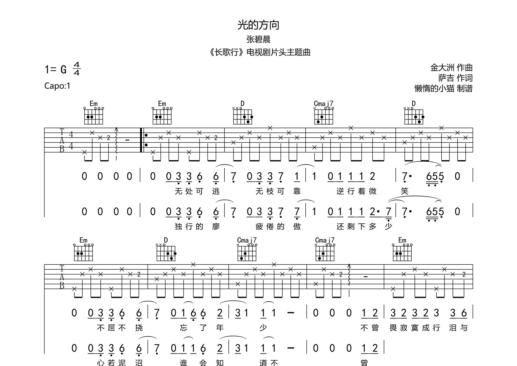 光的方向吉他谱张碧晨g调吉他弹唱六线谱懒惰的小猫编配