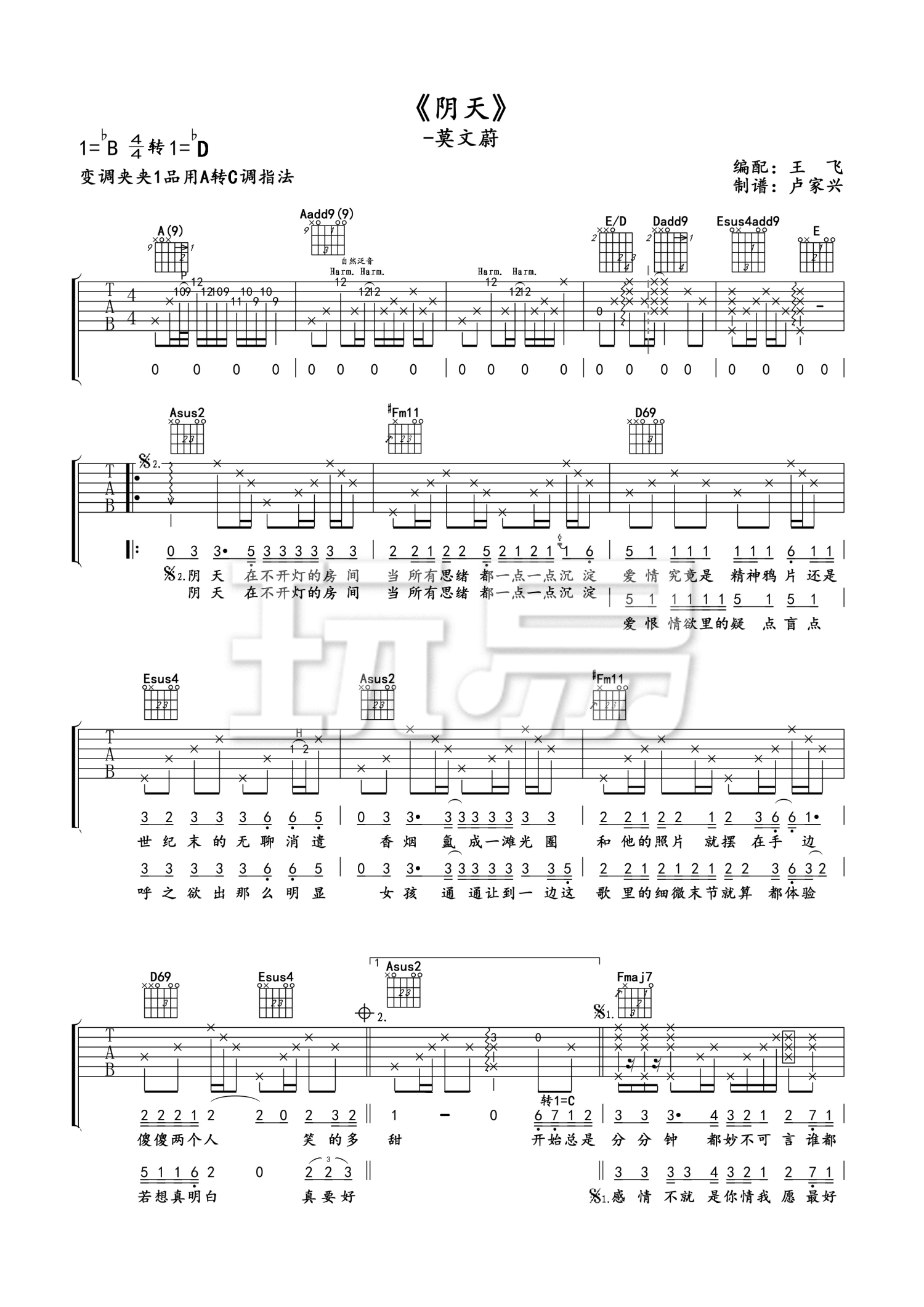 阴天(a转c调吉他弹唱谱)