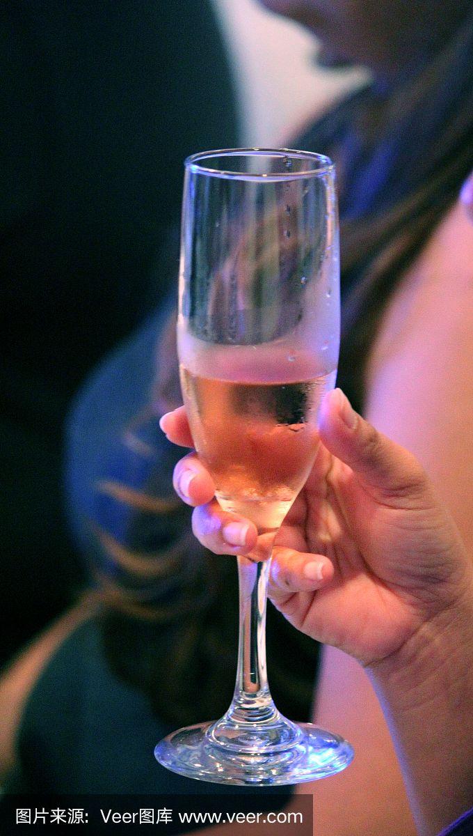 一个年轻女性,仅一个女性,仅一个人,许多,握,朦胧,模糊,高脚杯,红酒杯