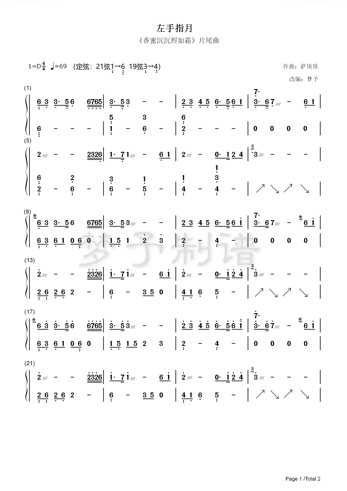 《左手指月》古筝谱d调