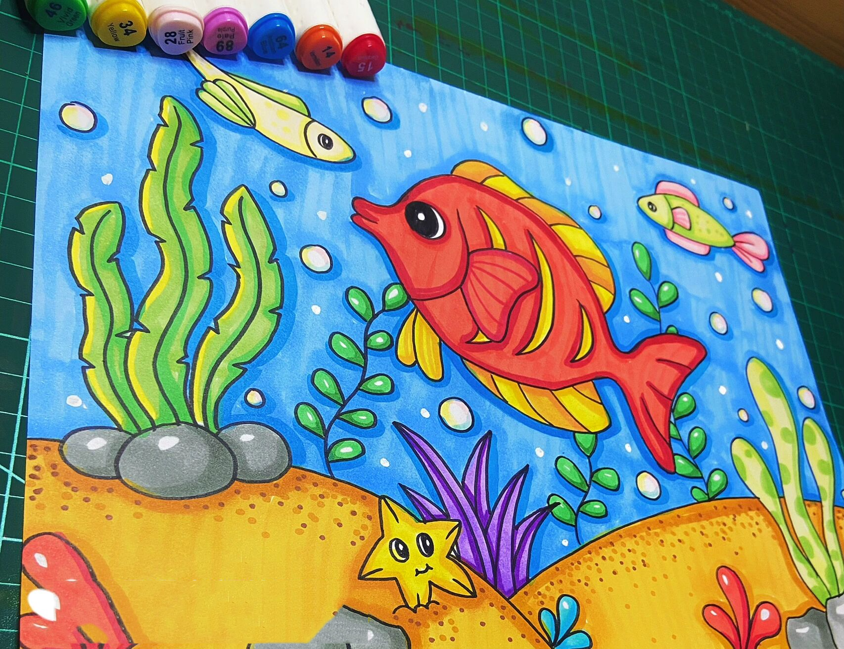 线描海底世界小鱼来喽#少儿美术 #少儿创意美术 #儿童画 # - 抖音