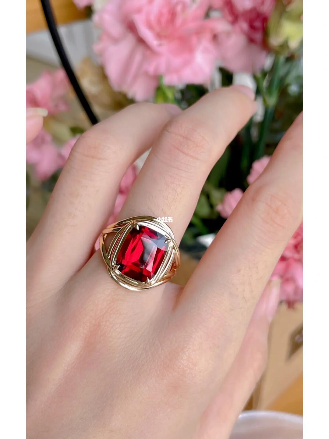 18k金黄金色天然石榴石戒指 长方形款,爪镶托底,柔美的酒红 - 抖音